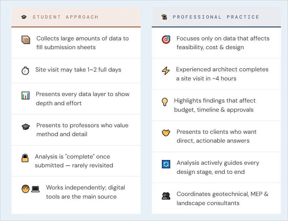 Many site studies remain academic exercises without practical conclusions. Students record constraints but do not show how the design responds to them.